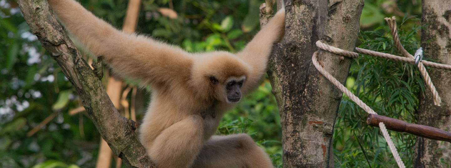 Ze lijken niet veel op ons, maar gibbons zijn toch echt mensapen. Door hun DNA, intelligentie, handige duimen en het geen staart hebben, worden ze tot deze groep gerekend. De gibbon lijkt van alle mensapen het minste op ons en dat komt door hun specialisatie in de boomtoppen. Met hun lange armen, speciale duimen en vocaal vermogen zijn gibbons volledig aangepast op het leven in de bomen.