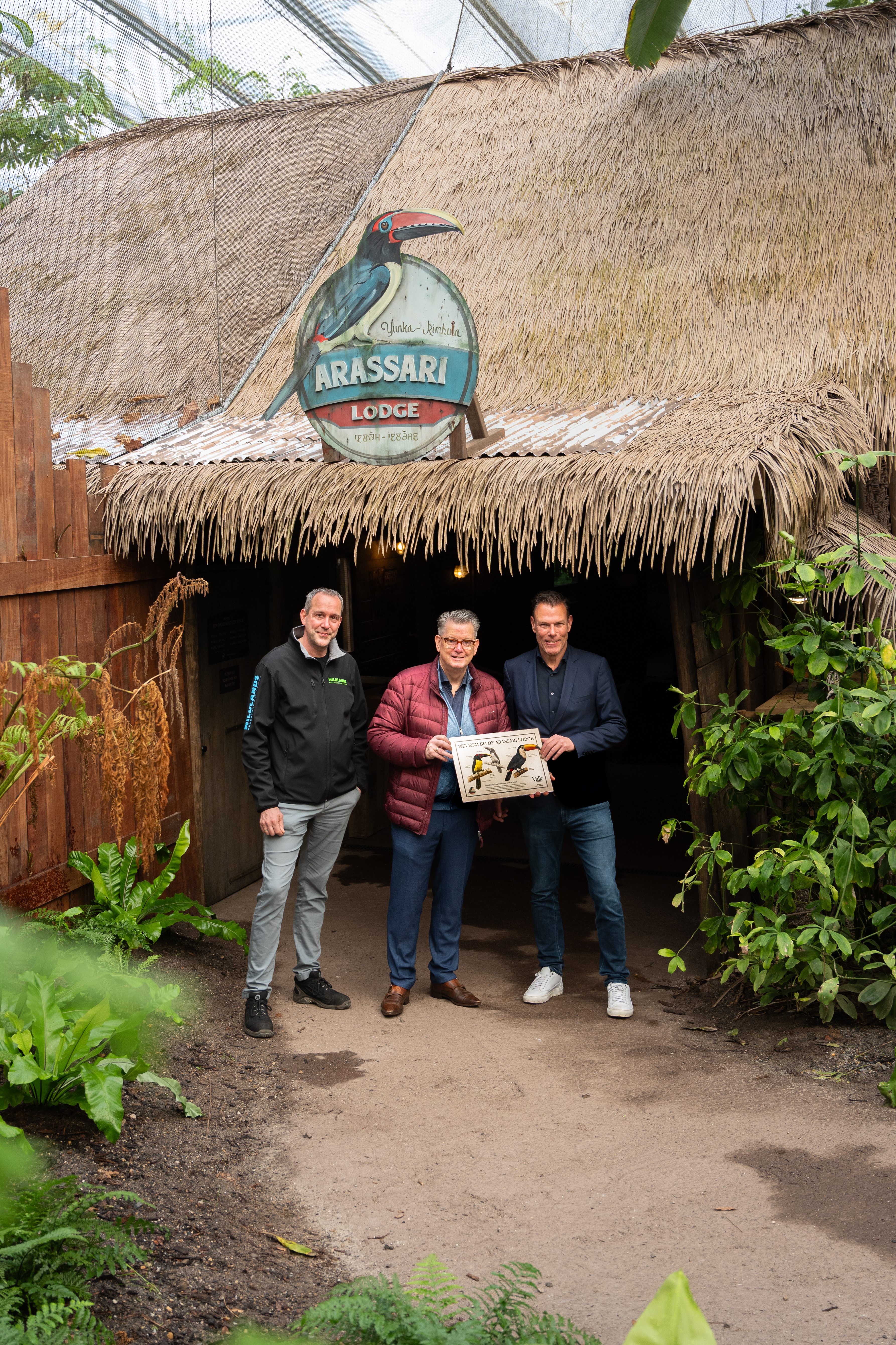 Ton Duivenvoorden van Van der Valk Emmen (midden) neemt het bordje in ontvangst bij de Arassari Lodge in Yunka, uit handen van WILDLANDS-directeur Julius Minnaar (rechts) en WNEF-voorzitter Jan Minze Zomer (links)