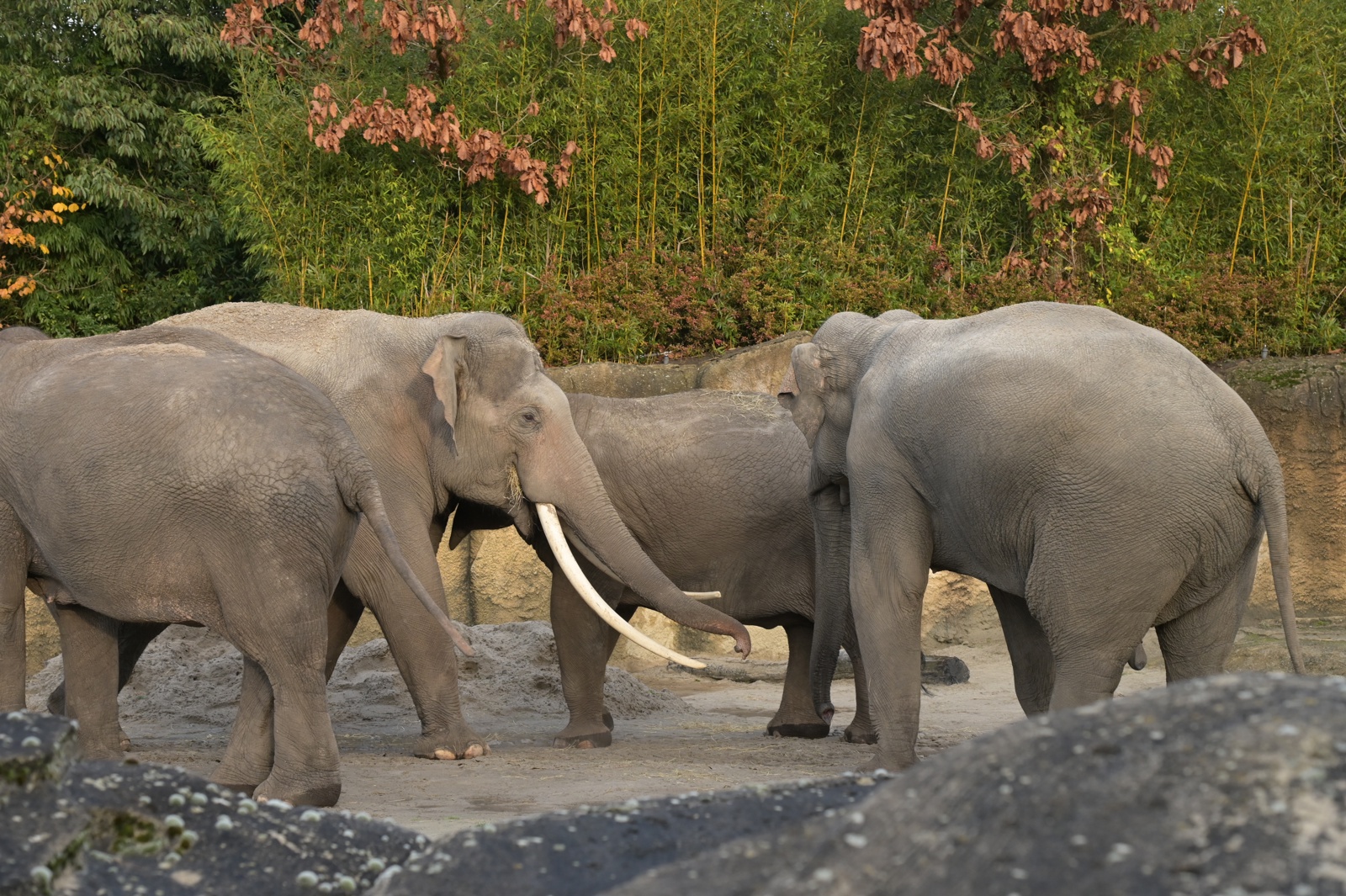 • 6 november: De 21-jarige stier Sibu arriveert en maakt rustig slurfcontact met jonge stieren Mauk en Manoa.