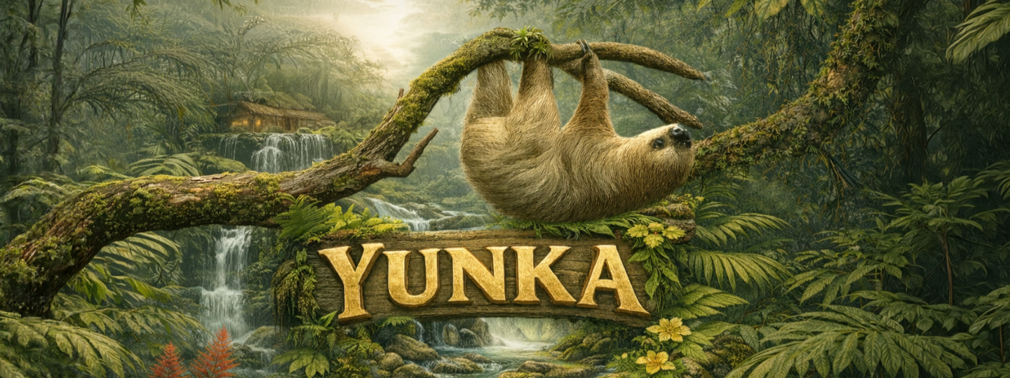 Half verstopt tussen het tropische groen staat een oud houten gebouwtje. Yunka, staat op het bordje dat aan de gevel hangt. Het voelt alsof we een onontdekte plek betreden. Hoge bomen, een smal stromend riviertje, af en toe beweegt er iets. Maar de jungle om ons heen is stil. Muisstil.